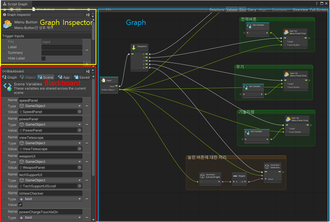 | 그래프 인스펙터를 닫거나 열기다. | 블랙보드를 닫거나 열기한다. | 그래프 인스펙터, 블랙보드를 화면의 왼쪽 혹은 오른쪽으로 이동시킨다. (참고-위 이미지에서는 보이지 않음) | 그래프 윈도우(그래프 편집창)을 확대하거나 축소한다. |