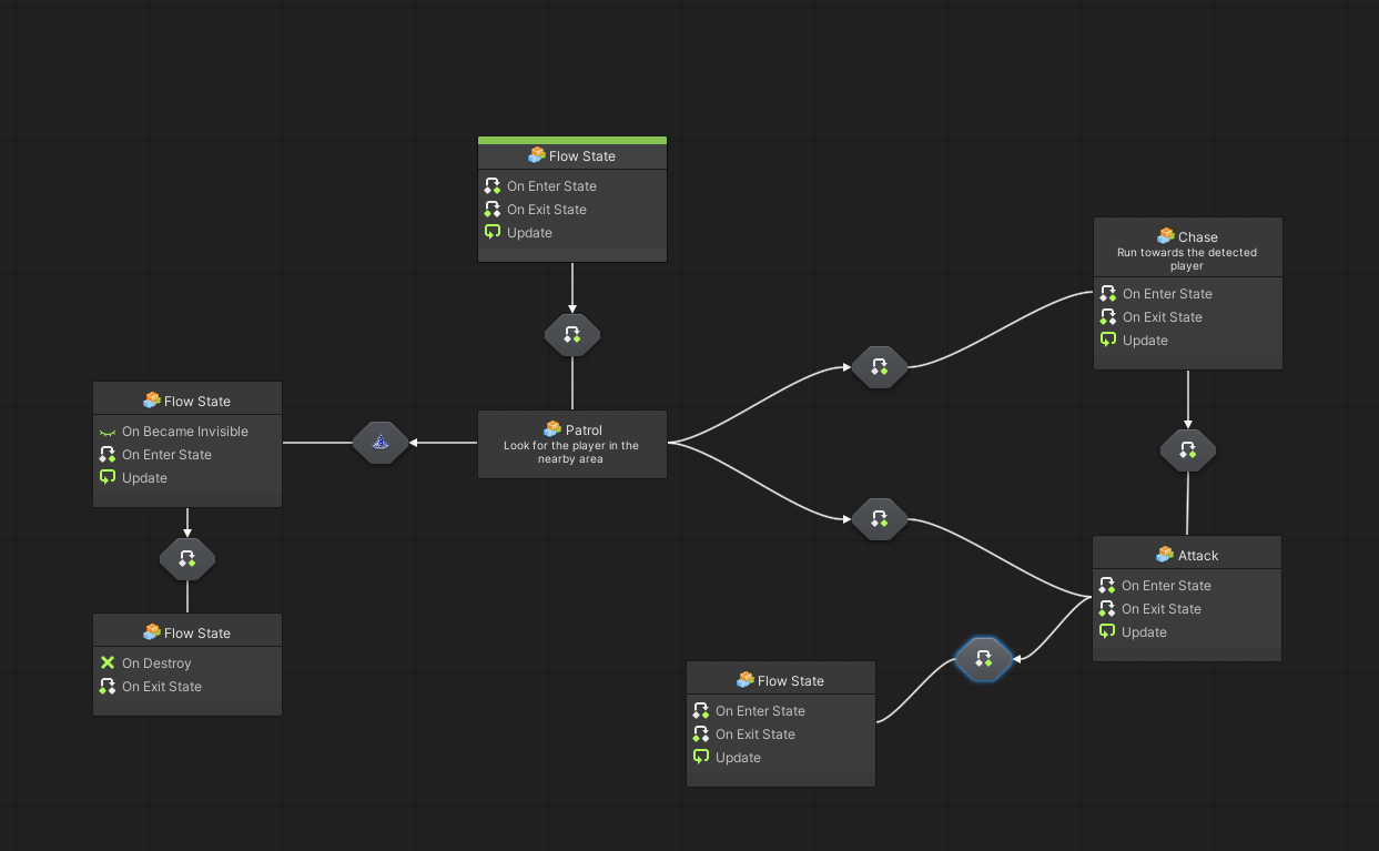 - 상태 그래프(State Graph)는 AI 행동, 씬(Scene) 또는 레벨 구조(level structure), 그리고 상태 개념이 요구되는 "고 수준(high-levle)" 로직(logic)을 만드는 데 사용된다. 예를 들어, 몬스터 NPC가 "패트롤(patrol)", "추적(chase)" 및 "공격(attack)" 상태를 가져야 하는 경우, 혹은 어떤 문이 "잠금(locked)", "잠금 해제(unlocked)", "열림(open)" 상태를 가져야 하는 경우이다. 상태 그래프(state graphs)는 "현재 나의 행동은 무엇인가? 그리고 언제 그 행동이 바뀌어야 하는가?"라는 질문에 가장 잘 답한다. (역자 주-일련의 프로그래밍 집합이 의미있는 행동을 하도록 하는 것이 상태 그래피이다. 즉, 왔다 갔다 경계를 하고 있던 몬스터가 플레이어 캐릭터가 나타나면 공격을 시작한다고 할 때 경계 상태에서 공격 상태로 전환되는 것을 구현하는 것이다.)