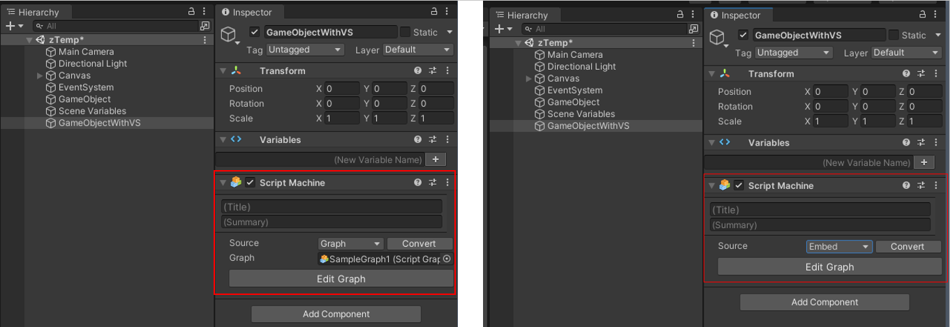 - Embed(임배드): 이 그래프는 GameObject에 직접 포함되어 있으며, 에셋(여기서는 스크립트 그래프 파일)이 하드 디스크가 아닌 GameObject에 바로 저장되어 진다.