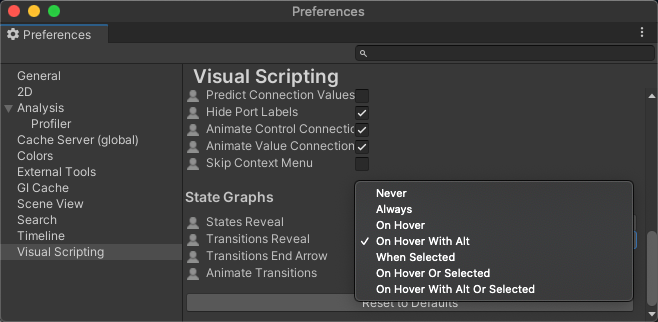 트랜지션 라벨은 항상 보이는 것이 디폴트이다. 이것이 그래프에서 너무 많이 차지하여 변경하고 싶다면, Unity > Preferences > Visual Scripting > State Graphs > Transition Display에서 디스플레이 트리거를 변경한다.