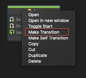 - 상태 노드위에서 마우스 오른쪽 클릭 후 Make Transition을 선택한다.