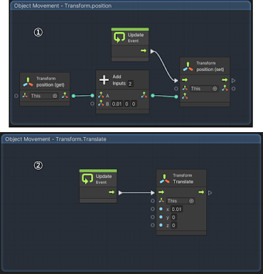 1번의 경우  Transform.position(get)으로 현재 자신의 월드 좌표를 가지고 와서 그 월드 좌표에 (0.01, 0, 0)을 더하기 한후 다시 자신의 그 더해진 좌표로 Transform.position(set)해주고 있습니다. Transform.position(set)은 그 좌표로 이동한다는 의미입니다. 이것이 PC 프레임마다 Update되기 때문에 0.01씩 계속 이동하게 됩니다.