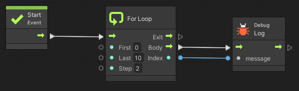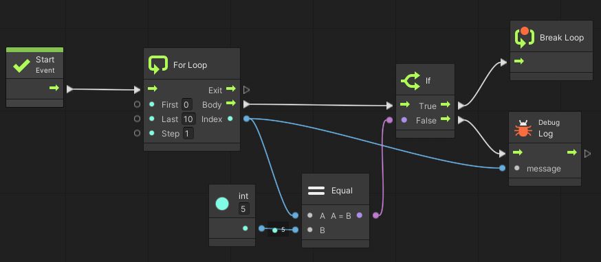 예를 들어, 아래 루프는 10까지 세도록 되어 있지만, Index가 5가 되는 순간 Break 유닛이 실행된다. 따라서 출력은 0, 1, 2, 3, 4만 된다.