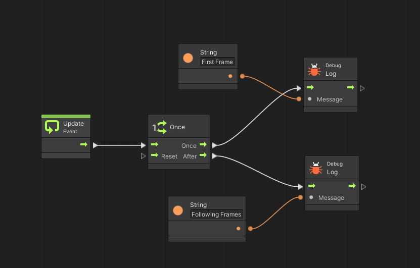 Once 유닛은 그 이후의 로직을 오직 한 번만 실행한다. (아래 예시는 First Fram이 1회 출력되고 이후 부터는 Following Frames만 반복 출력 된다.)