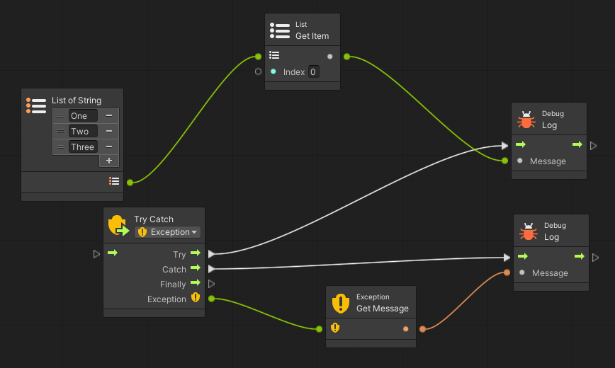 Try Catch 유닛은 발생한 예외(Exceptions)를 처리한다. 일부 코드에 오류기 의심될 경우 게임이 크래시(중단)되는 것을 방지할 수 있다.