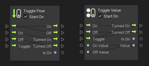 Toggle Value 유닛은 ON/OFF 여부에 따라 두 개의 입력 값(On Value 또는 Off Value) 중에 어느 하나의 값을 선택한다. 포트의 작동은 Toggle Flow 유닛과 똑같이 동작한다.