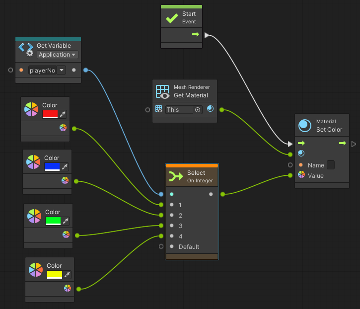 예를 들어 playerNo에 따라 색상을 선택하는 "Select On Integer" 유닛이 있다.