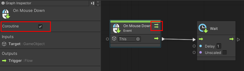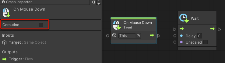 Unity의 비동기성(실행이 지연되는 기능 또는 동작)은 코루틴(coroutine)으로 처리하고 있다(멀티쓰레드 방식이 아니다). Wait 유닛을 사용하려면 코루틴처럼 스크립트가 동작해야 한다고 비주얼 스크립팅에 알려야 한다. 그 방법은 스크립트를 시작시키는 초기 이벤트의 Coroutine 체크박스에 체크해 주면 된다. 그래프 인스펙트에는 다음과 같이 보인다.