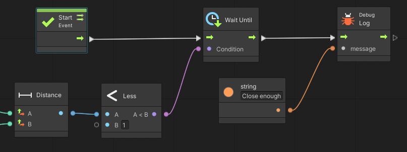Wait Until 유닛은 주어진 조건이 충족될 때까지 실행을 멈추게 한다. 아래 예시는 A < 1 조건이 될 때까지 "Close enough"는 콘솔에 출력되지 않는다. 즉, A < 1 인 상태가 되는 순간 출력이 된다.