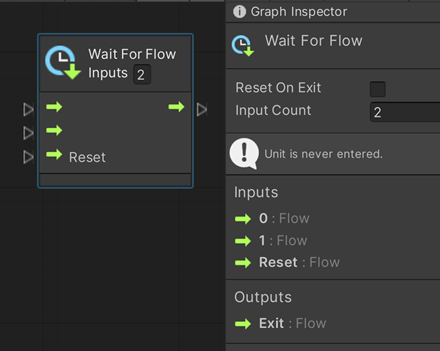 Wait For Flow 유닛은 모든 입력 스크립트들이 최소한 한 번은 모두 처리 될 때까지 실행을 지연시킨다. 여러 Events 또는 Frames에 걸쳐 발생하는 조건들을 그룹화하는데 매우 유용한 방법이다. 다른 프로그래밍 언어에서는 이 개념을 "Promises(약속들)"이라고 부르기도 한다.