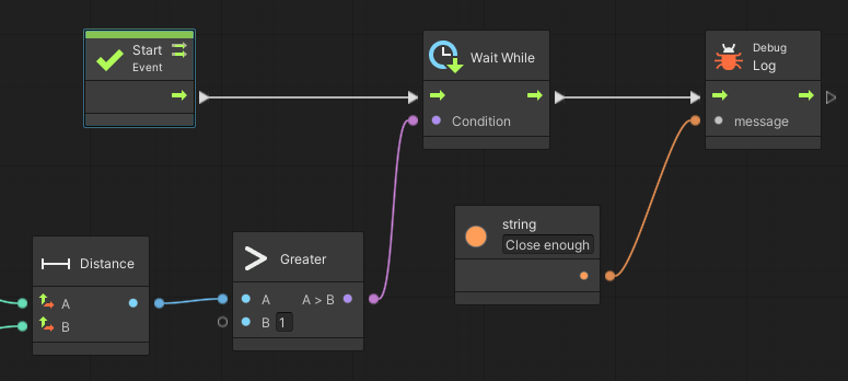 Wait While 유닛은 Wait Until 유닛과 정반대이다. 즉, 주어진 조건이 충족되는 한 실행을 멈추고 있다. 아래 예시는 A > 1인 조건인 동안 콘솔에 "Close enough"이 출력되지 않는다. 즉, A > 1이 아닌 상태가 되는 순간 출력이 된다.