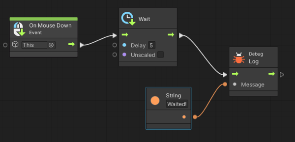 Wait For Seconds 유닛은 가장 단순하고 가장 자주 사용되는 Wait 유닛이다. 이 유닛은 실행을 일정 시간(초) 단위로 지연시킨다. (역자주-아래 예시는 마우스 클릭시 5초후에 "Waited!"라는 메시지가 콘솔에 출력된다.)