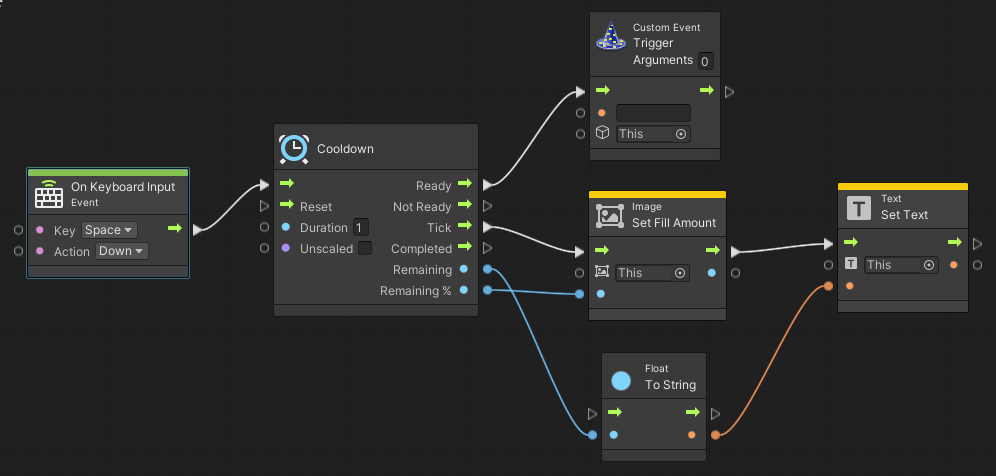 아래의 예는 Cooldown이 있는 단순한 사격 시스템으로 다음 사격 가능 시간 까지 남은 시간을 비율로 표시해주는 이미지 바와 시간 값을 표시해주는 텍스트가 있는 UI 스크립트 그래프이다.