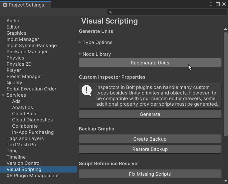 - Project Settings 창에서 Visual Scripting을 선택하고 Regenerate Units를 클릭하여 퍼지 파인더에 새 유닛을 추가한다.