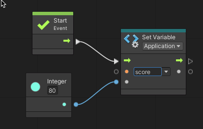 변수의 이름은 표준 값 입력 포트이기 때문에 문자열(string)을 반환하는 다른 포트에 연결할 수도 있다. "동적 변수"이기 때문에 플레이 모드가 실행중에는 변수가 변경된다.(역자주 - int 변수를 string 변수에 연결하면 string 변수가 플레이 모드일 때 int 변수로 변경된다.)
