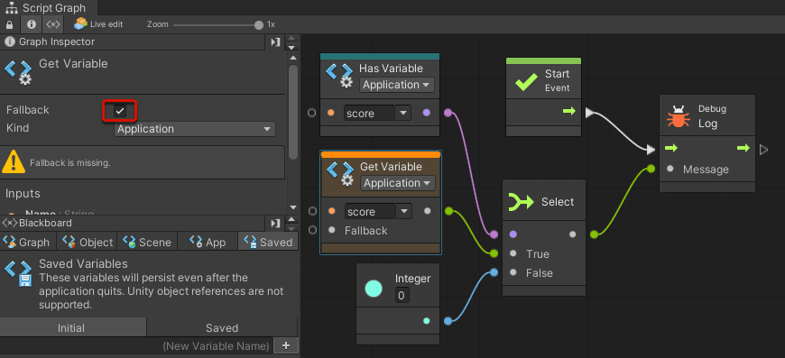 참고: Get Variable 유닛을 선택 하고 그래프 인스펙터에서 Fallback 체크 박스에 체크를 하면 더 쉽게 같은 작업을 수행할 수 있다. 이렇게 하면 변수가 정의되지 않은 경우 반환되는 유닛에 fallback 입력이 추가된다.