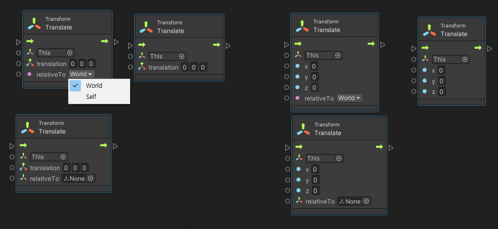 Visual Script에서는 Transform.Translate를 다양한 상황에서 쉽게 사용할 수 있도록 옵션처럼 여러 형태의 함수를 제공하고 있습니다.
