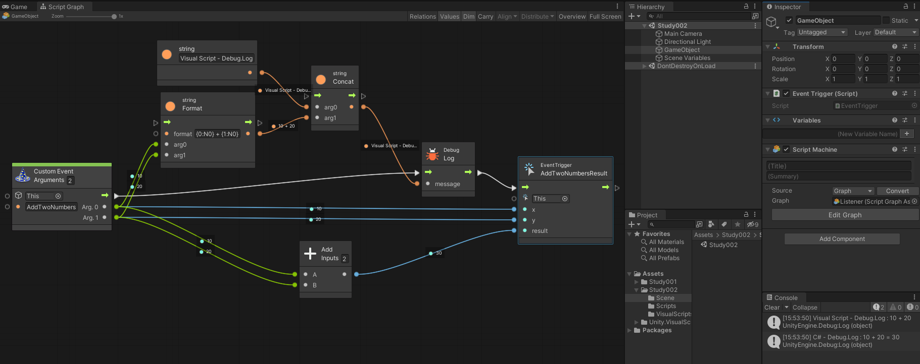 EventTrigger.cs => Visual Script에 있는 AddTwoNumbers라는 CustomEvent를 Trigger한다.
